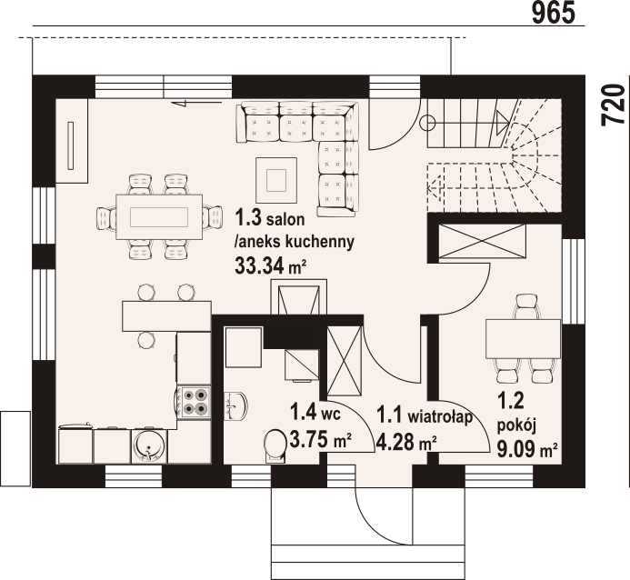 | 1.3 salon z aneksem kuchennym | 33,34 m² |