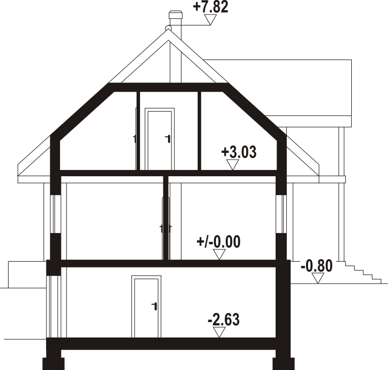 Projekt domu mieszkalnego parterowego, z poddaszem mieszkalnym, podpiwniczonego, z garażem.